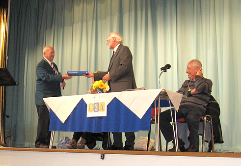 Just before he left the platform, Malcolm handed the Blue Book of the Third Age Trust Guidelines to Brian.