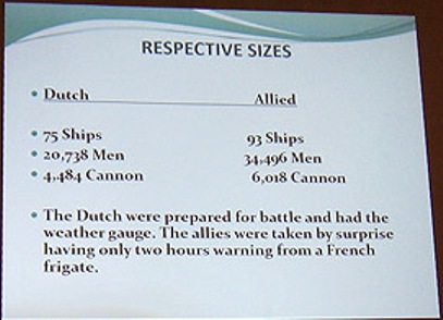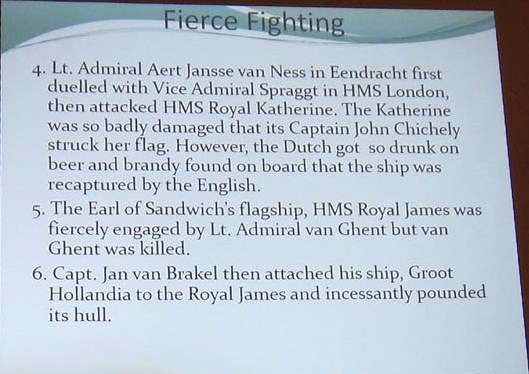 No one in the audience had heard of Sole Bay, so a slide was shown which showed it is the bay of Southwold. It appears that in the 1670s England wanted to stop the Dutch from leaving their ports in Holland but they had anticipated this and put together a fleet of 75 warships under the command of de Ruyter and with a following wind sailed across the North Sea.
