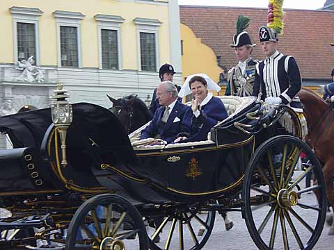 Swedish King & QueenIt was their National Day and the first time they had been given a holiday to celebrate this. Our courier took us to the Royal Palace where we waited to see King Carl XVI Gustav, Queen Silvia and their family leave in coaches with a mounted escort on their way to Skansen for celebratory events. We then made our way to the Kungstradgarden (the King's Garden) where the people were enjoying Taste of Stockholm week and partaking of food and drink from a variety of stalls. Some of us had fish and chips and sat at long tables with the locals!